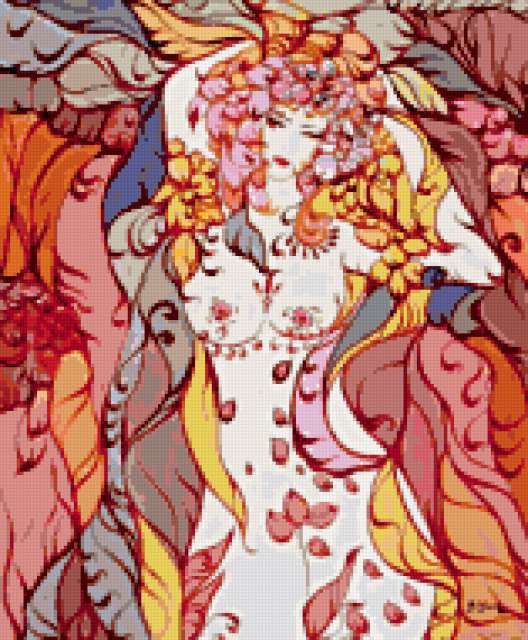 Ориентировочно так, схема вышивки «Woman - Abstract», созданная автором pandreevska, будет выглядеть при отшиве на канве. Размер данной вышивки равен 157x190 крестов, при этом используется 46 цветов. Ключевые слова, по которым можно найти эту схему: Li Yan, woman, abstract, colorful, женщина. Также, вы можете взглянуть на оригинальную картинку, соответствующую данной схеме вышивки.