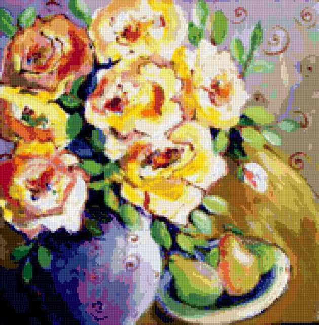 Ориентировочно так, схема вышивки «Yellow Floral», созданная автором pandreevska, будет выглядеть при отшиве на канве. Размер данной вышивки равен 187x190 крестов, при этом используется 67 цветов. Ключевые слова, по которым можно найти эту схему: elaine cory. Также, вы можете взглянуть на оригинальную картинку, соответствующую данной схеме вышивки.