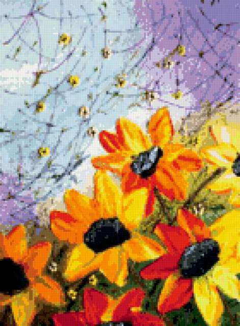 Ориентировочно так, схема вышивки «Yellow Flowers», созданная автором pandreevska, будет выглядеть при отшиве на канве. Размер данной вышивки равен 140x190 крестов, при этом используется 63 цветов. Ключевые слова, по которым можно найти эту схему: floral, цветок, декорация, yellow, bright. Также, вы можете взглянуть на оригинальную картинку, соответствующую данной схеме вышивки.
