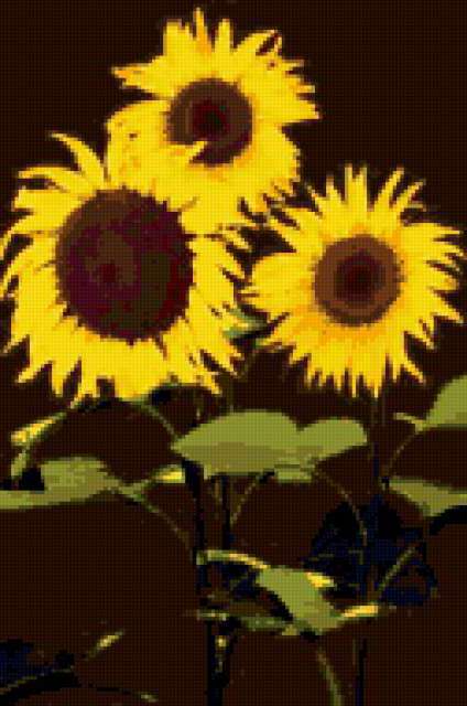 Ориентировочно так, схема вышивки «Yellow Sunflowers», созданная автором me4o, будет выглядеть при отшиве на канве. Размер данной вышивки равен 126x190 крестов, при этом используется 23 цветов. Ключевые слова, по которым можно найти эту схему: sunflowers, flowers, yellow, brown. Также, вы можете взглянуть на оригинальную картинку, соответствующую данной схеме вышивки.