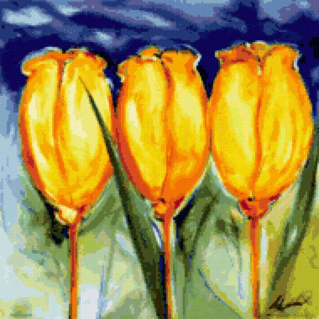 Ориентировочно так, схема вышивки «Yellow Tulips», созданная автором pandreevska, будет выглядеть при отшиве на канве. Размер данной вышивки равен 190x190 крестов, при этом используется 55 цветов. Ключевые слова, по которым можно найти эту схему: floral, цветок, декорация, yellow. Также, вы можете взглянуть на оригинальную картинку, соответствующую данной схеме вышивки.