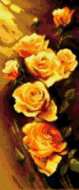 Ориентировочно так, схема вышивки «Yellow roses», созданная автором lukrecija12, будет выглядеть при отшиве на канве. Размер данной вышивки равен 79x190 крестов, при этом используется 36 цветов. Ключевые слова, по которым можно найти эту схему: flower. Также, вы можете взглянуть на оригинальную картинку, соответствующую данной схеме вышивки.