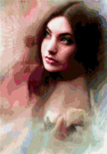 Ориентировочно так, схема вышивки «Zadumchivaja», созданная автором lukrecija12, будет выглядеть при отшиве на канве. Размер данной вышивки равен 130x187 крестов, при этом используется 56 цветов. Ключевые слова, по которым можно найти эту схему: zenshina, portret. Также, вы можете взглянуть на оригинальную картинку, соответствующую данной схеме вышивки.