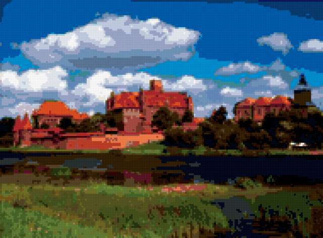 Ориентировочно так, схема вышивки «Zamok», созданная автором lukrecija12, будет выглядеть при отшиве на канве. Размер данной вышивки равен 190x140 крестов, при этом используется 45 цветов. Ключевые слова, по которым можно найти эту схему: priroda, pejzaz. Также, вы можете взглянуть на оригинальную картинку, соответствующую данной схеме вышивки.