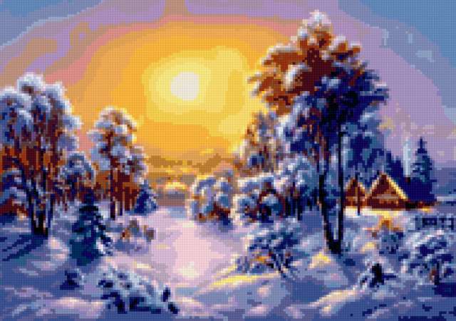 Ориентировочно так, схема вышивки «Zima», созданная автором lukrecija12, будет выглядеть при отшиве на канве. Размер данной вышивки равен 190x134 крестов, при этом используется 46 цветов. Ключевые слова, по которым можно найти эту схему: priroda. Также, вы можете взглянуть на оригинальную картинку, соответствующую данной схеме вышивки.