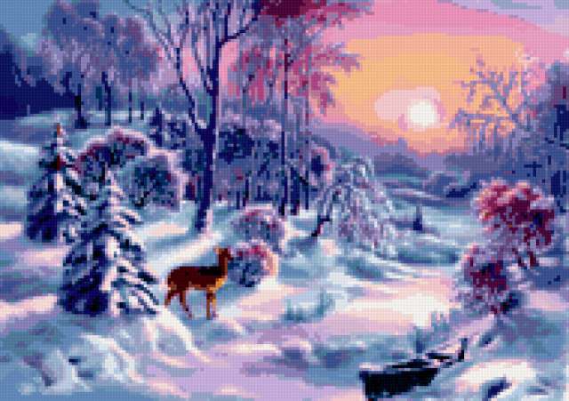 Ориентировочно так, схема вышивки «Zima», созданная автором lukrecija12, будет выглядеть при отшиве на канве. Размер данной вышивки равен 190x134 крестов, при этом используется 46 цветов. Ключевые слова, по которым можно найти эту схему: priroda. Также, вы можете взглянуть на оригинальную картинку, соответствующую данной схеме вышивки.