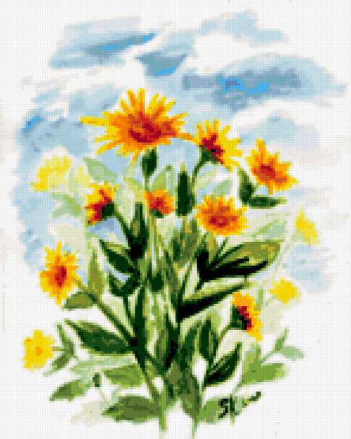 Ориентировочно так, схема вышивки «Zioltye cvety», созданная автором lukrecija12, будет выглядеть при отшиве на канве. Размер данной вышивки равен 148x185 крестов, при этом используется 48 цветов. Ключевые слова, по которым можно найти эту схему: cvety. Также, вы можете взглянуть на оригинальную картинку, соответствующую данной схеме вышивки.