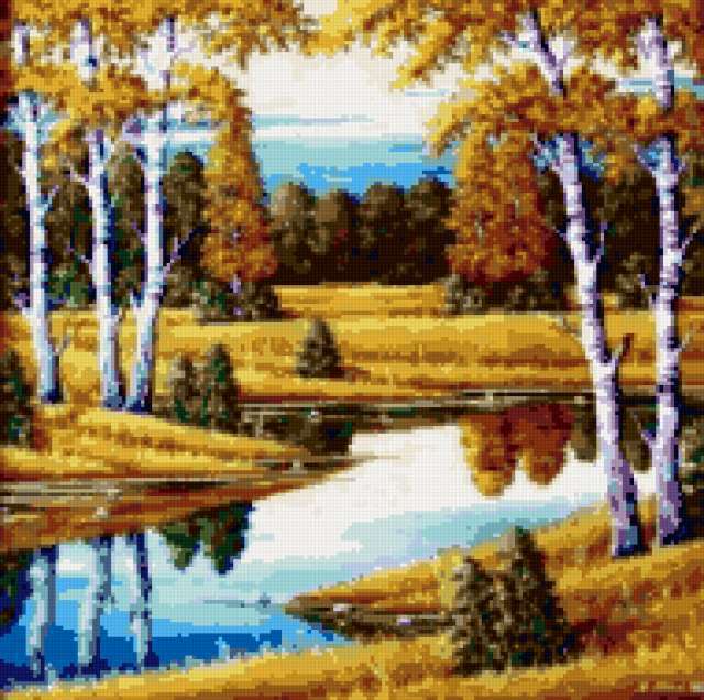 Ориентировочно так, схема вышивки «Zolotaja osenj», созданная автором Lamisa, будет выглядеть при отшиве на канве. Размер данной вышивки равен 190x189 крестов, при этом используется 40 цветов. Ключевые слова, по которым можно найти эту схему: природа, пейзаж, осень. Также, вы можете взглянуть на оригинальную картинку, соответствующую данной схеме вышивки.